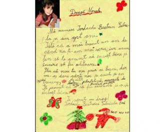 Adrian Tănase, 10 ani, i-a scris Moşului:  “Dragă Moş Crăciun, anul acesta am fost la şcoală, am fost cuminte, am scris, m-am jucat cu frăţiorii mei. Îmi doresc o bluză groasă pentru iarnă, o pereche de pantaloni negri groşi şi o pereche de mănuşi groase, ca să mă duc la şcoală şi să nu-mi fie frig. Aş mai vrea o maşinuţă cu telecomandă, un calculator şi o bicicletă. Dragă Moşule, te iubesc!”